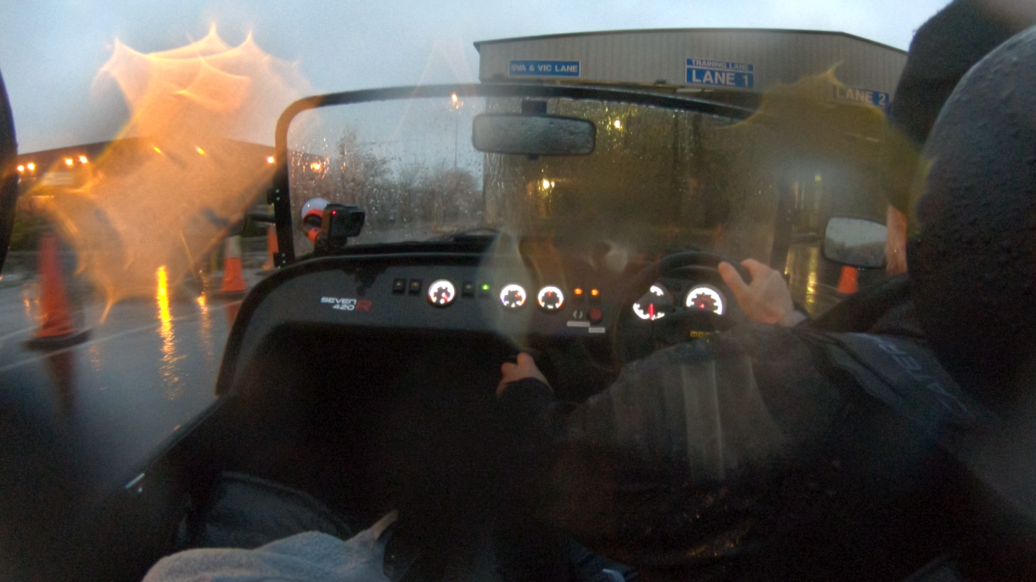 After getting ready, with obligatory hat and coat, I started the car and got it out of the garage. Imagine the scene: I’m sat on the drive with the garage now closed, it’s not really light yet, engine running, 4-point harnesses on and me ready to go. It’s raining and the windscreen is covered in water.